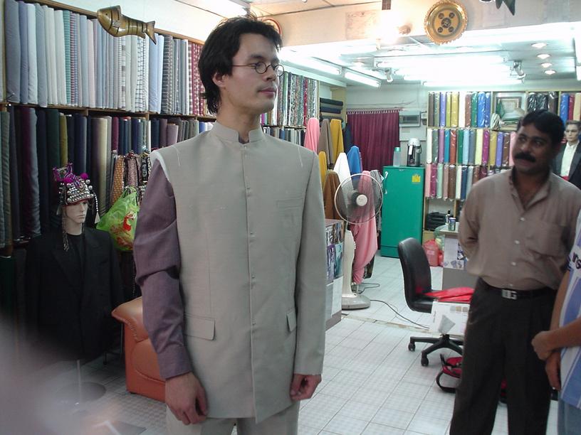 Shopping is irrestible. Me in a made-to-measure white-tie suit. They put on the sleeves when the body of the jacket is deemed ok by the customer.